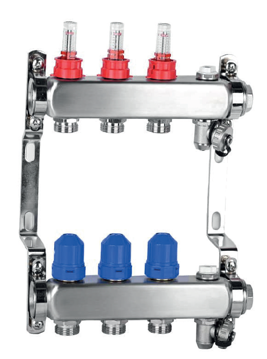 Ogni circuito è dotato di un flussimetro ed un vitone che consente di regolare il flusso di fluido termico in modo da garantire una distribuzione uniforme del calore o del fresco nell’ambiente e di poter abbinare una valvola termostatizzabile M30x1.5 collega a sua volta ad un termostato ambiente.